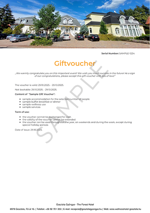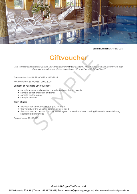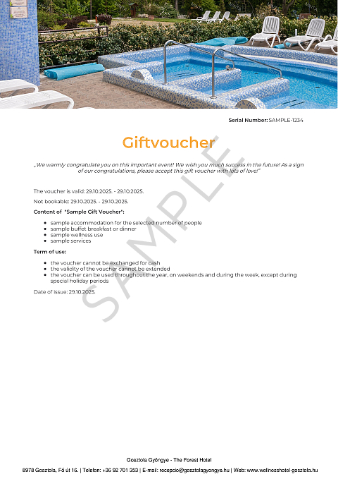 - Use of our wellness area: indoor Mediterranean-style pool with forest view; swimming pool with overflow edge (28°C), jacuzzi (34°C); Finnish sauna, infrared sauna, light therapy; outdoor hot-water adventure pool, sun terrace, sunbeds, bathrobe in room (for adults), hairdryer